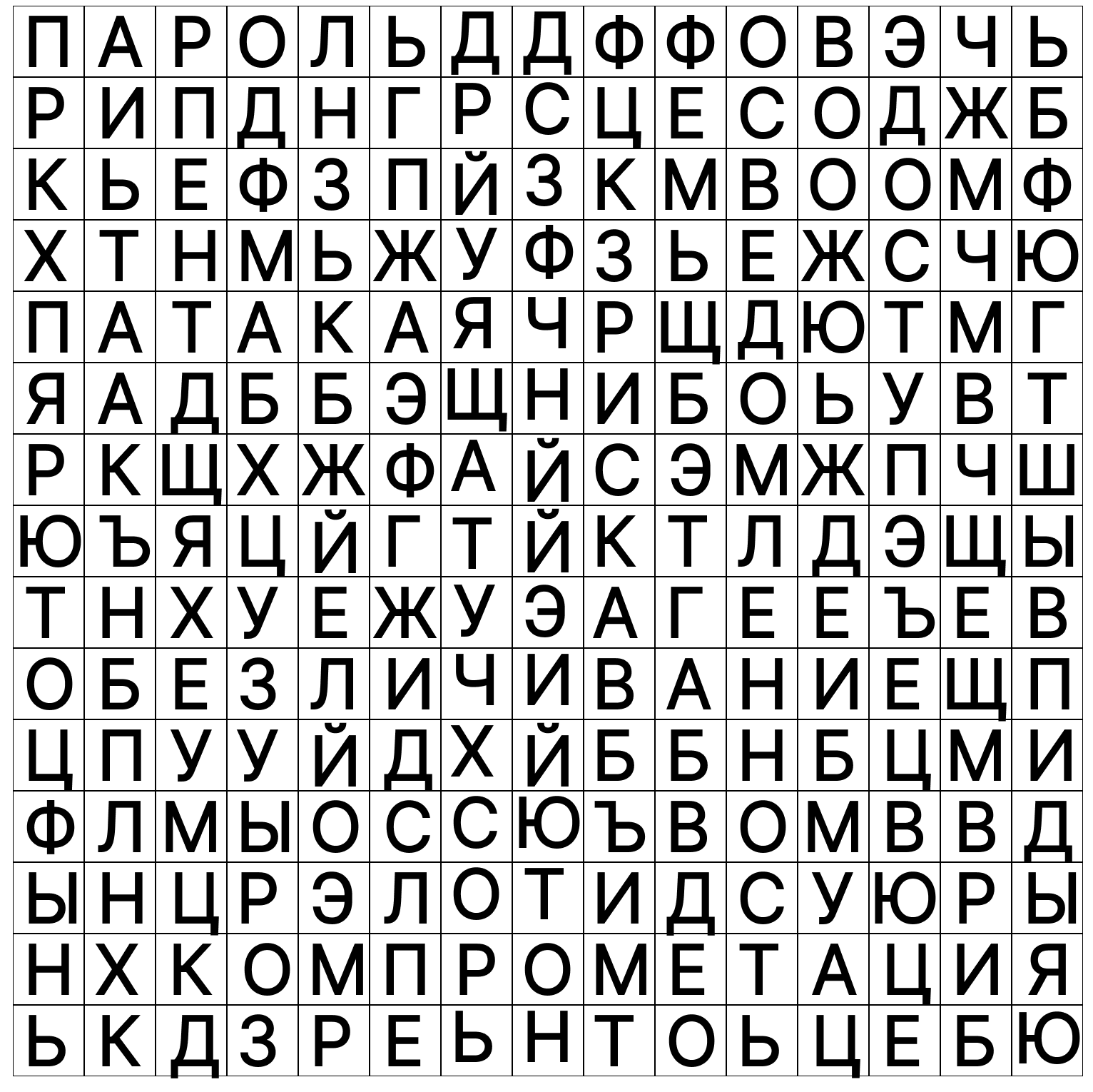Здесь спрятано семь слов, нужно найти все, ведь их первые буквы складываются в слово, что и служит паролем от склада.